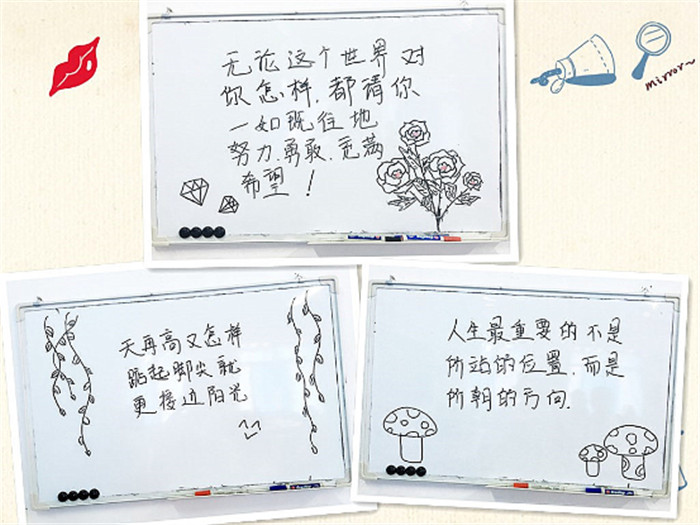在2014級2班教室里醒目的一角,有一塊白板,每天都在為同學(xué)們呈現(xiàn)著不一樣的名言美句,而書寫它們的,就是班級的宣傳委員——賀常宇。