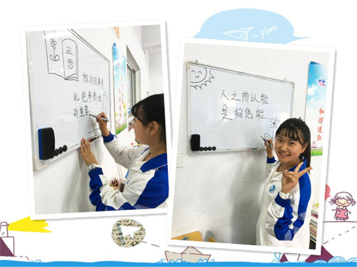 為了打造一個積極向上、充滿書香氣息的班級文化氛圍,賀常宇同學(xué)自入學(xué)之初便配合班主任老師,承擔(dān)了書寫這塊宣傳欄的任務(wù)。她每天不斷收集優(yōu)美勵志、打動人心、充滿正能量的美言佳句和生活常識,每日早早便將這塊宣傳園地設(shè)計得豐富多彩。經(jīng)典的文字內(nèi)容,再配以俏皮的裝飾插畫,總能吸引住同學(xué)的目光,引得大家贊嘆不已,并給了同學(xué)很多的生活啟迪。賀常宇同學(xué)將這項工作從于家校區(qū)一直延續(xù)到金山校區(qū),每日更新,從未間斷。除此之外,在教室外的班級文化展評前,也總能看見她利用休息時間不斷修補與粘貼作品的身影。