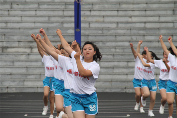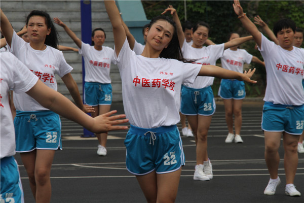 81名學(xué)生身著白色T恤藍(lán)色短褲,排著整齊的方陣,在大家熟悉的《最炫民族風(fēng)》的旋律下,跳起了頗具民族特色的健身操。這套操融合了藏族舞的甩袖、四步回轉(zhuǎn),維吾爾族的拍掌彈指,蒙古族的硬肩、騎馬,土家族的拍打,景頗族的甩銀袍,傣族的孔雀舞等多種民族舞蹈的精髓元素,風(fēng)格獨(dú)特,優(yōu)美動(dòng)感。