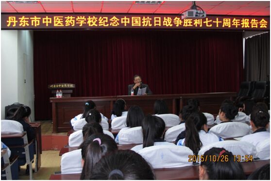 今年是世界反法西斯戰(zhàn)爭和中國抗日戰(zhàn)爭勝利70周年,為了更好的弘揚(yáng)抗日精神和愛國主義精神,激發(fā)同學(xué)們的愛國熱情,培養(yǎng)和踐行社會主義核心價值觀,我校聯(lián)合丹東市關(guān)工委、丹東團(tuán)市委和丹東市教育局,特別舉辦了“紀(jì)念抗日戰(zhàn)爭勝利70周年”專題報告會。我們還很榮幸的請到了原丹東市公安局開發(fā)區(qū)分局副局長、現(xiàn)丹東市吾老講師團(tuán)成員沙吉慶老師到校為同學(xué)們做報告。沙老師用一個個鮮活的事例帶我們再次回顧了那段歷史,同學(xué)們受益匪淺。戰(zhàn)爭和報復(fù)不會為我們贏得尊重,發(fā)憤圖強(qiáng),這才是我們慶祝勝利、祭奠英烈、銘記歷史的最好方式!讓我們銘記歷史、緬懷先烈、珍愛和平、開創(chuàng)未來!