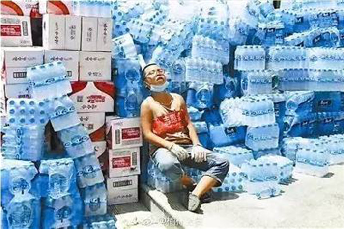 一個戴著眼鏡、留著寸頭的小男孩,背靠在由礦泉水堆起的“山”旁,嘴巴半張,在太陽下蜷著腿熟睡。小男孩的身上用別針別著一塊紅布,上面印著“志愿者,遠竹中學”字樣。這是綏德抗洪救災中的“最小志愿者”胡智博。
