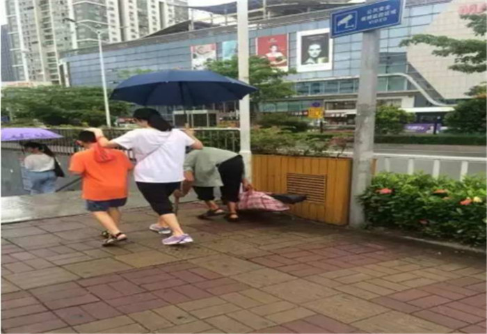 而她的右手拿著傘為一個佝僂著腰的老大爺擋雨。